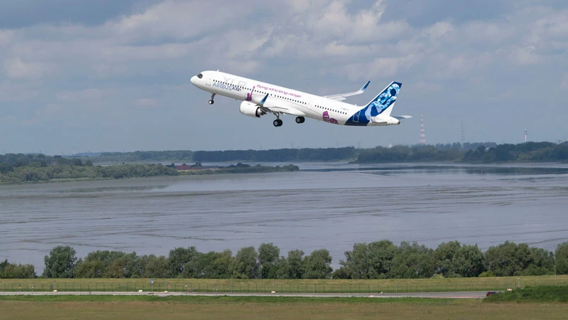 Alle Augen der am Rande des Vorfelds aufgereihten Mitarbeiter:innen und Gäste richten sich ans Ende der Startbahn in Richtung Elbe. Noch wenige Minuten zuvor war genau hier mit der „Queen Mary 2“ eines der größten Kreuzfahrtschiffe der Welt vorbeigeglitten. Und gleich steht in Hamburg-Finkenwerder ein wichtiger Moment in der jüngeren Airbus-Geschichte an: Der Erstflug des neuen Bestsellers Airbus A321XLR, des ersten Schmalrumpf-Flugzeugs für Langstrecken mit bis zu elf Stunden Flugzeit. Äußerlich unterscheidet sich die A321XLR nicht von einem gewöhnlichen Airbus A321 und dessen Nachfolgemodell A321neo.