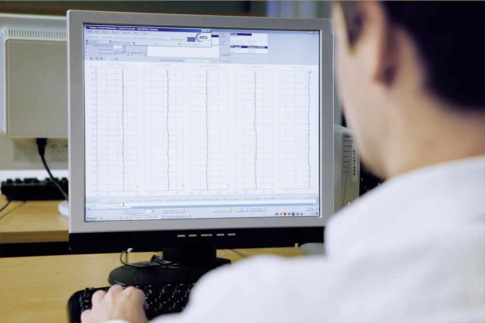Computergestützt lassen sich technische Probleme an Triebwerken heute erkennen, lange bevor sie den Flugbetrieb stören oder aufwändige Reparaturen nach sich ziehen. Das Engine Trend Monitoring der MTU Maintenance ermöglicht eine umfassende Überwachung der Triebwerksparameter durch eine MTU-eigenentwickelte Monitoring-Software. Und ein Blick in die Zukunft zeigt, dass Advanced Analytics und maschinelle Lernverfahren künftig eine automatisierte Analyse großer Datenmengen ermöglichen werden. Damit lassen sich genaue Vorhersagen über den Zustand der Triebwerke am Flügel treffen. Triebwerksinstandhaltungen können so bis hin zu den Modulen immer besser geplant und die Kosten für die Airlines verringert werden.