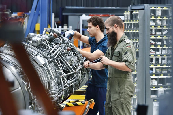 Die Instandsetzung erfolgt seither unter der Führung der Industrie, wobei immer Soldat:innen in die verschiedenen Arbeitsbereiche und Schlüsselstellen bei der MTU integriert sind. Auf diese Weise entsteht ein direkter Draht zu den Einsatzverbänden sowie ein Austausch über die Prozesse. „So konnten wir einen optimalen Instandsetzungsprozess aufsetzen, der die Erfahrungen von beiden Seiten berücksichtigt“, erläutert Stefan Burger, Leiter der MTU-Auftragsteuerung Instandsetzung EJ200 / RB199. Das Modell war so erfolgreich, dass später weitere Programme, etwa der Hubschrauberantrieb MTR390, folgten.