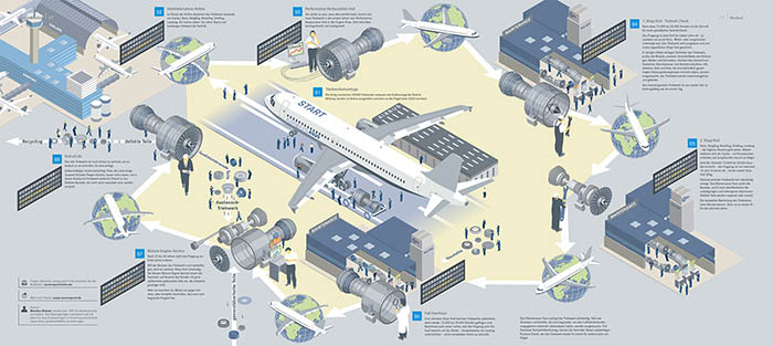 Etwa alle 15.000 bis 30.000 Flugstunden wird das Triebwerk gründlich untersucht und überholt. Dabei müssen bestimmte Teile aufgrund gesetzlicher Vorgaben komplett ausgetauscht werden; andere werden aufwändig untersucht und repariert. In jedem Fall geht es darum, die strengen Sicherheitsbestimmungen für Flugantriebe jederzeit zu gewährleisten und die Leistungsfähigkeit des Triebwerks wieder herzustellen. Je älter das Triebwerk wird, desto größer ist die Reparaturtiefe, also der Grad, bis zu dem es beim Shop Visit zerlegt, befundet, repariert und wieder aufgebaut wird. Am Ende seines „Lebenslaufs“ können Eigner und Instandhalter gemeinsam entscheiden, wie sein Wert weiter erhalten bleiben kann.