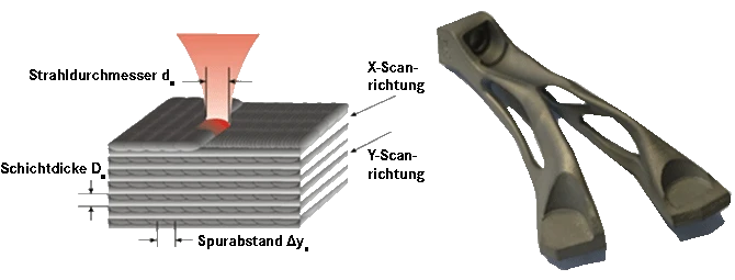 Links: Additiver Werkstoffaufbau: Hier am Beispiel des sukzessiven, lokalen Aufschmelzens von Pulverlagen mit dem Laser.