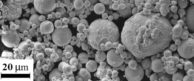 Metallische Pulverpartikel (hier: Nickel-Superlegierung). Qualitätsmerkmale sind vor allem die Reinheit von Fremdpartikeln, die Durchmesserverteilung, die Form und Oberflächenbeschaffenheit sowie die chemische Verteilung und das Gefüge im Innern der Partikel.