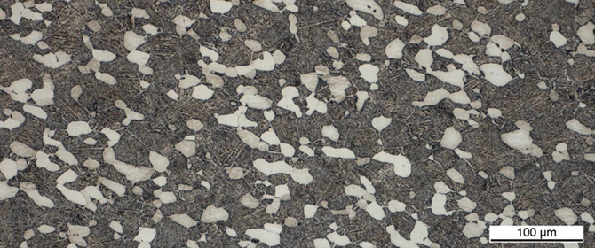 Gefüge von Titanlegierungen in Flugtriebwerken sind vor allem durch die Anteile und Struktur zweier Phasen (α / weiß und β / dunkel) gekennzeichnet. Typischerweise sind die Strukturen lamellenartig und globular. Im Beispiel des Bildes sind beide Ausprägungen gemischt, eine sogenannte bimodale Struktur.