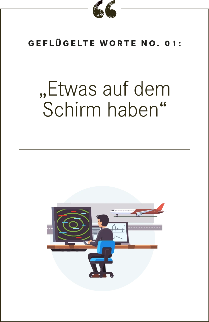 Verantwortungsvolle Menschen haben eine Wahrnehmung dafür, was um sie herum wichtig ist oder wichtig werden könnte. Sowohl ganz gegenständlich etwa bei physischen Hindernissen, aber auch im übertragenen Sinn, wenn es um mögliche Entwicklungen von Dingen, Ideen oder Vorhaben geht. Etwas im Blickfeld zu haben und zu beobachten, das drückt man heute gern mit der Formulierung „ich habe es auf dem Schirm“ aus. Ihr Ursprung lässt sich klar auf die Luftfahrt zurückführen. Auch auf die heutige – denn Fluglotsen im Tower bekommen alle Flugzeuge auf ihren Radarschirm, sobald sie in die Kontrollzone des jeweiligen Lotsen einfliegen. Eine Aufreihung an Papierstreifen – oder das gleiche in digitaler Form – erinnert jeden Lotsen an alle Flüge die gerade zu überwachen sind. Der Begriff stammt ursprünglich aus dem Zweiten Weltkrieg, als aus dem alten deutschen Begriff „Funkmess“ das Radar (Radio Detection and Ranging) wurde. Bei dieser Ortungstechnik werden elektromagnetische Wellen ausgesandt, die von fliegenden Objekten als Echo reflektiert, empfangen und ausgewertet werden und so auf dem Radarschirm erscheinen.