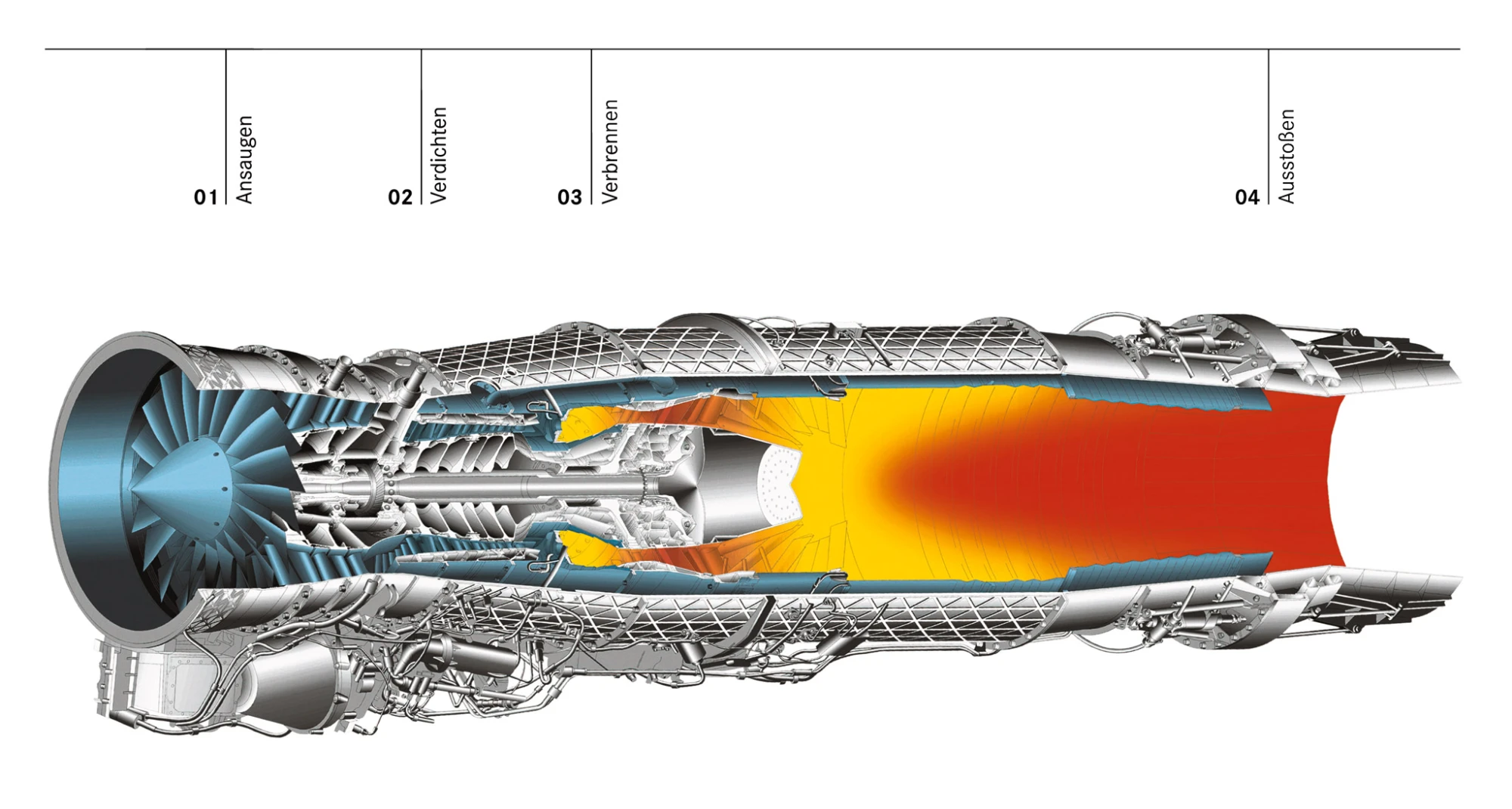 Nachdem die Luft angesaugt wurde, fließt sie zunächst durch den Niederdruckverdichter, dann durch den Hochdruckverdichter. Mit jeder Stufe wird die Luft weiter komprimiert, wodurch ihr Druck und ihre Temperatur steigen. Diese Verdichtung ist essenziell, um die Effizienz der nachfolgenden Verbrennung zu maximieren und somit einen höheren Schub zu erzeugen.