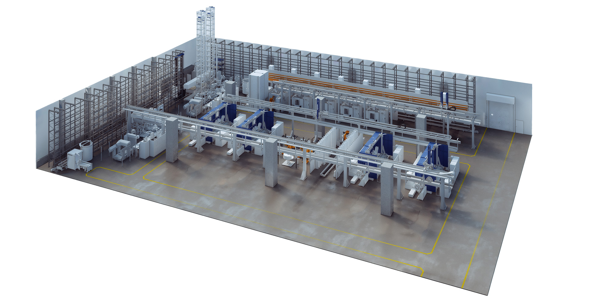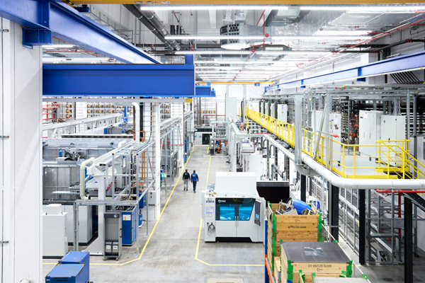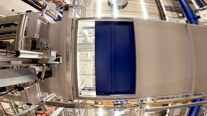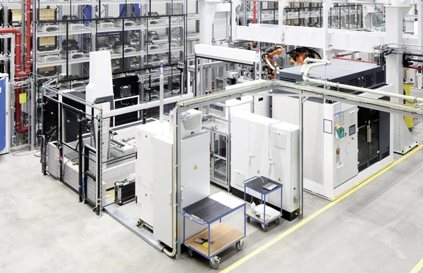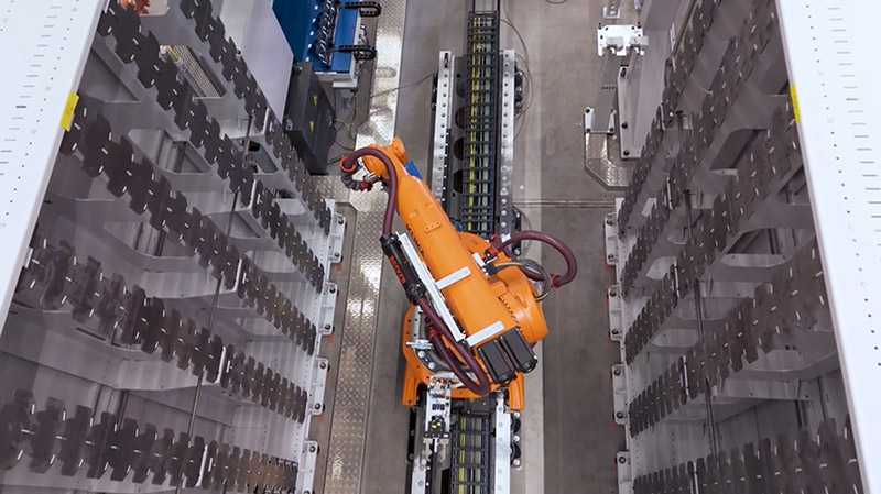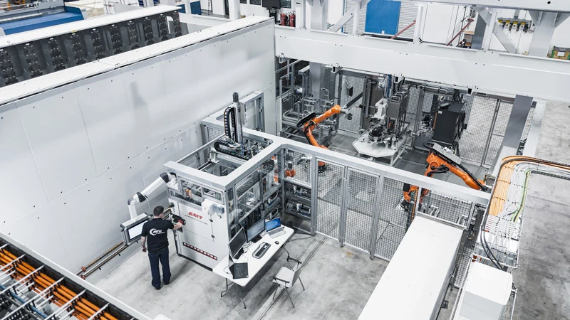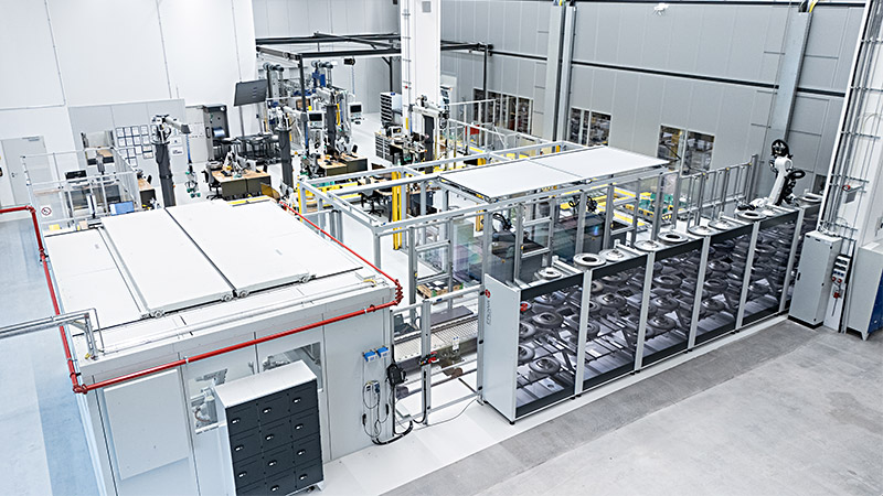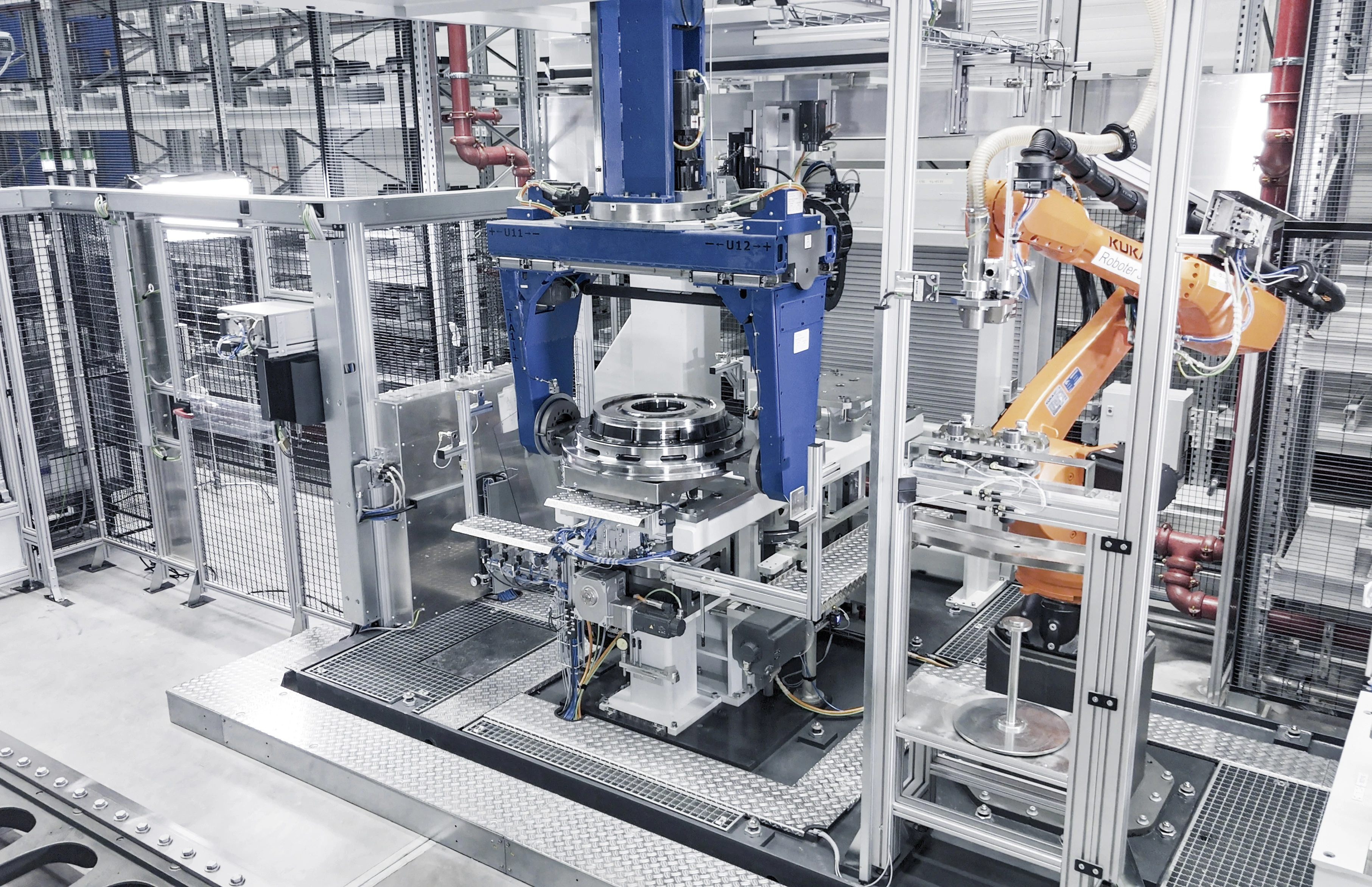 Die Art und Weise, wie hier produziert wird, das wird schon auf den ersten Blick klar, unterscheidet sich deutlich von vergleichbaren Anlagen zur Herstellung von Turbinenscheiben. „Es ist die modernste Fertigungshalle für Turbinenscheiben weltweit, weil wir das Rüsten der Bauteile, aber vor allem auch das Rüsten der Werkzeuge vollautomatisiert mit Hilfe von Industrierobotern erledigen können“, berichtet MTU-Projektleiterin Christina Braun. Auch die Unabhängigkeit der einzelnen Bereiche ist ein Alleinstellungsmerkmal der Anlage. „Wir wollten bewusst ein Handlingssystem, das entkoppelt ist vom Maschinenarbeitsraum. Das war in bestehenden Anlagen immer ein begrenzender Faktor, weil der Rüstvorgang für Werkstück und Werkzeuge stets die Maschine blockiert hat.“