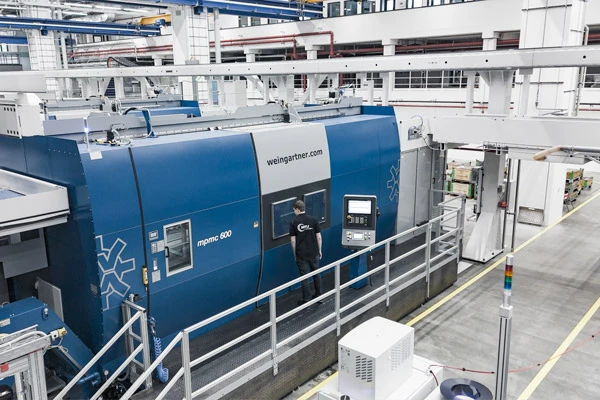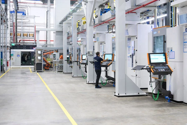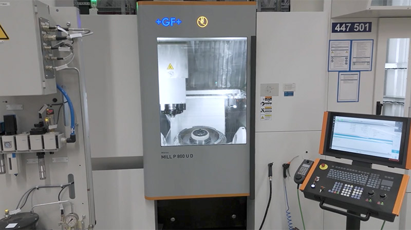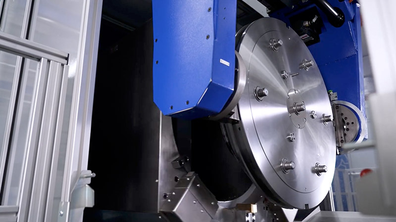 Vier Dreh- und vier Fräsmaschinen stehen für die Bearbeitung der Turbinenscheiben bereit. Die Rohlinge, die vom polnischen MTU-Standort in Rzeszów kommen, werden zunächst gedreht und dann zum Räumen in die benachbarte Produktionshalle gebracht. Die anschließende Fräsbearbeitung erfolgt wiederum in der neuen Fertigungshalle. Die Beladung der Werkstücke erfolgt auch hier automatisiert über eine Schleuse, die Werkzeuge werden im Werkzeugspeicher hinter den Maschinen gelagert.