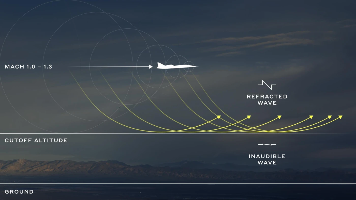 Mach cutoff is a physical phenomenon that causes sound waves to refract and bend back up into the atmosphere on a U-shaped trajectory away from the ground. This means a supersonic aircraft emitting sound waves in flight that would normally be audible as a boom on the ground can pass overhead without any noticeable effect for humans. To do this, the aircraft must adapt precisely to the prevailing conditions of the area it is overflying. The key factors here are the atmosphere and the nature of the terrain. The aircraft’s cruising speed must be constantly adjusted so that the sonic boom waves don’t extend below a certain height—the cutoff altitude.