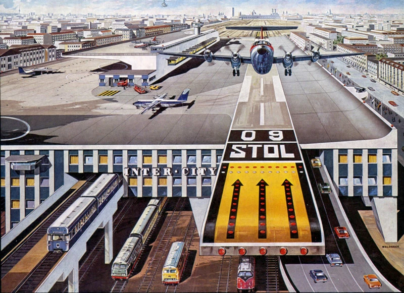 Vertical takeoff air taxis are high up on the aviation agenda for the 2020s. Soon you could be catching one from outside your front door, or at least from downtown locations previously unsuitable for air traffic. But let’s first go back over half a century, when Germany was poised to usher in the golden age of vertical takeoff aircraft for commercial passenger flight. Striking colorful illustrations document how the planners of the time envisioned vertical takeoff aircraft that would depart from locations like the roof of Munich’s central train station.