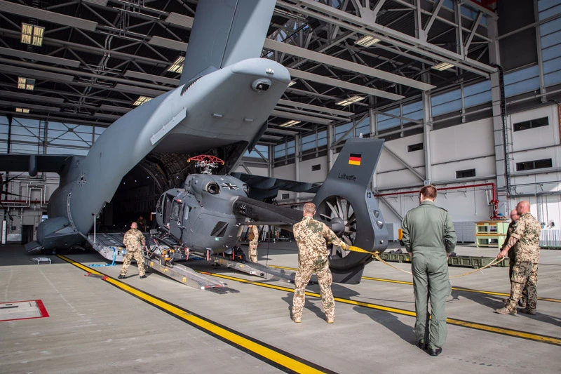 A H145M LUH SOF helicopter is loaded into an A400M—demonstrating the German Air Force’s high flexibility and transport capability during complex evacuation operations.