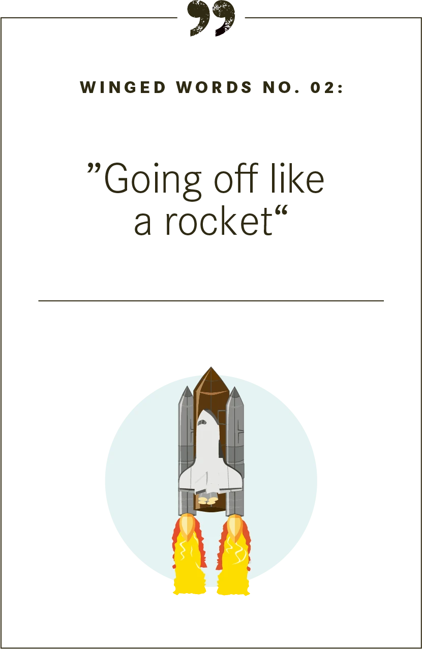 Rockets have a surprisingly long pedigree in colloquial expressions. The German phrase for “going off like a rocket” made it into the dictionary back in the 19th century, where it was understood to mean making a sudden, hasty movement. Rockets firing into the sky have long inspired poetic turns of phrase with their proverbial speed and explosive nature. But the meaning of “rocket” has changed over time. Earlier uses focused on the negative consequences of pride and arrogance; for instance, Germans used to say: “When the rocket is at its highest, that’s when it explodes.” At the turn of the 20th century, someone with a short temper would be referred to as a “rocket.” Since the 1950s, though, “going off like a rocket” has tended to describe behavior that is particularly lively, fast and spirited.
