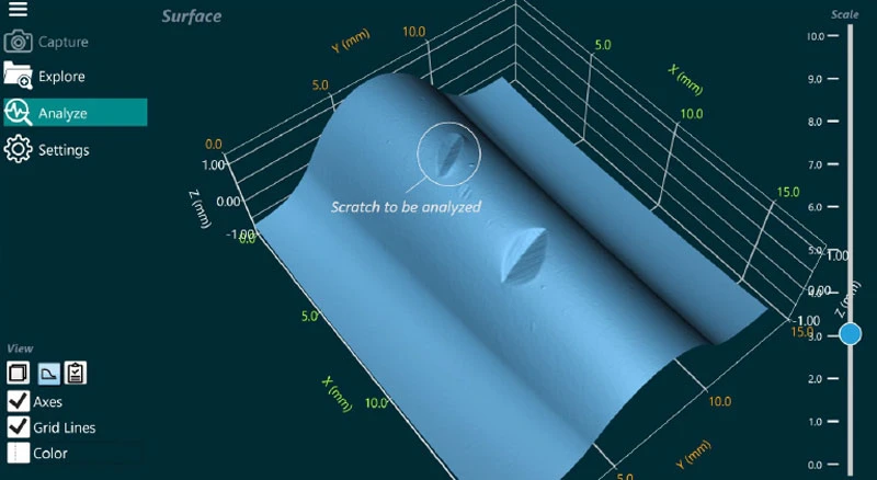Step 1: The image of the structure of an unevenness can be easily measured with the help of the GelSight measuring device. First, the GelPad is pressed onto the area to be examined. After pressing the trigger, a 3D model is created from the six perspective photos. The location of the damage to be analyzed can now be defined on this model.