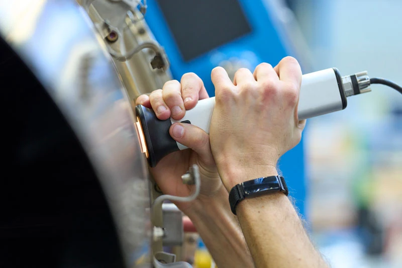 Measurement of surfaces: The mobile, handy measuring device is pressed against the spot to be examined on the engine. It can also be used to analyze places that are more difficult to reach.