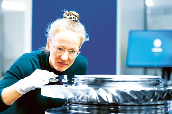 In the testing room this morning, everything revolves around compressor rotors. It’s 9 a.m. and experts from production, operations scheduling, quality control and structural mechanics are inspecting a component. One of them is Lea Mainberger, Process Specialist for Work Hardening Processes. Together, they will clarify how a special cover for blisks—high-tech components that integrate blade and disk—can be optimized in the production process.