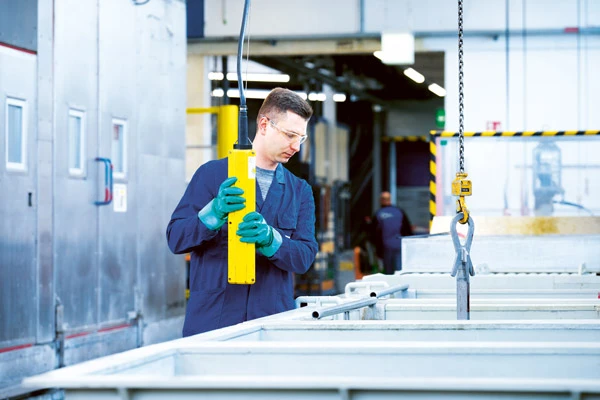 The fixture covers the areas that are not supposed to be coated. Blümel expertly checks whether the component fits perfectly into the new fixture. Is the tightness right for submersion into the electroplating bath? What about the fixture’s chemical resistance? It’s 85 centimeters in diameter. Large components have their own hoists to ensure safe handling of both the component and the fixture.