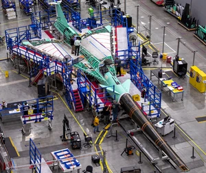 Low-boom test aircraft: Lockheed Martin began building the X-59 in 2018. In this image, the nose is being positioned at the front of the aircraft.